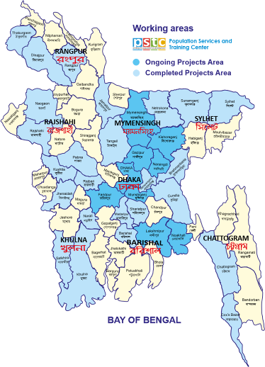 PSTC has been in its operation through 72 offices with 22 clinics and has been working in 20 districts of Bangladesh which are Dhaka, Gazipur, Narayanganj, Munshigonj, Kishoregonj, Narsingdi, Noakhali, Lakshmipur, Mymensingh, Sherpur, Netrakona, Cumilla, Feni, Chandpur, Chattogram, Cox’s Bazar, Faridpur, Jashore, Khulna and Kushtia. A number of 862 workforces are currently involved around the country to carry out the PSTC’s missions. The male– female ratio is 1:2. PSTC worked and has been working in several districts of Bangladesh and covered more than half of the country which is depicted in the map shown below.